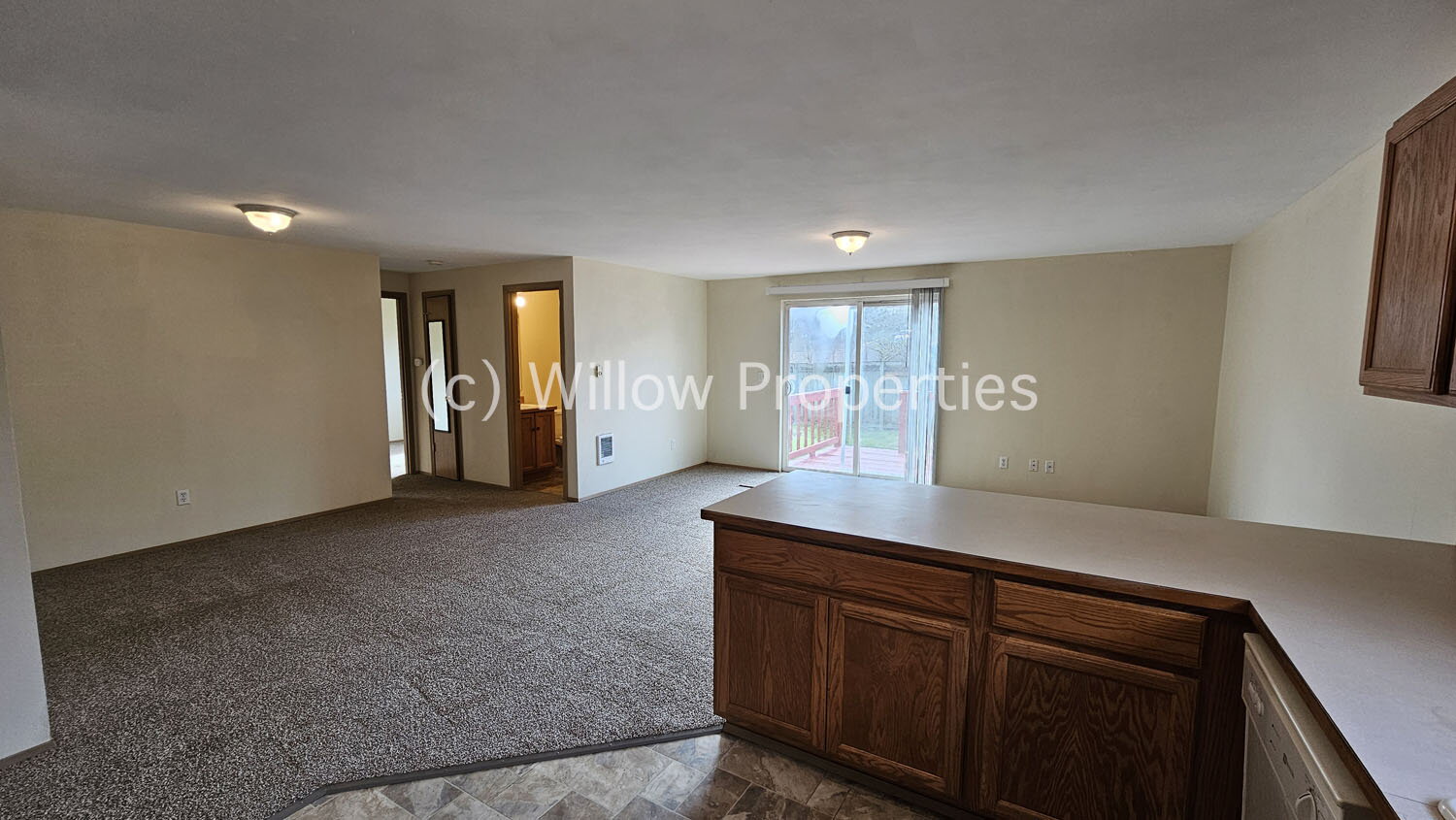Open family room with slider access to a large deck and a fully fenced backyard — perfect for outdoor entertaining or relaxing. A two-car garage provides convenient parking and additional storage. Tenant pays: Electric & garbage. Owner pays: Water & septic maintenance. This home is currently occupied and will be available 4/23/26. Please do not go near the doors or windows.